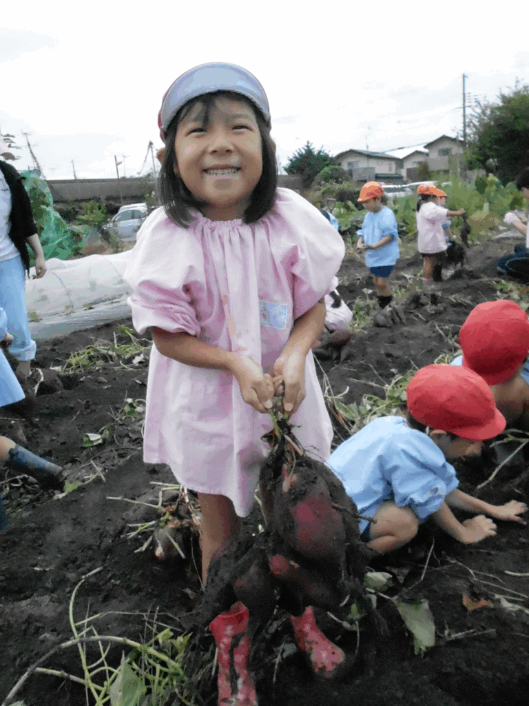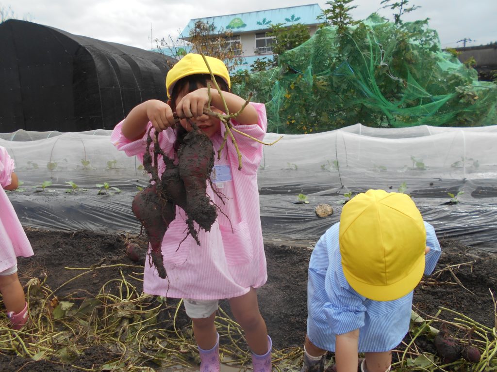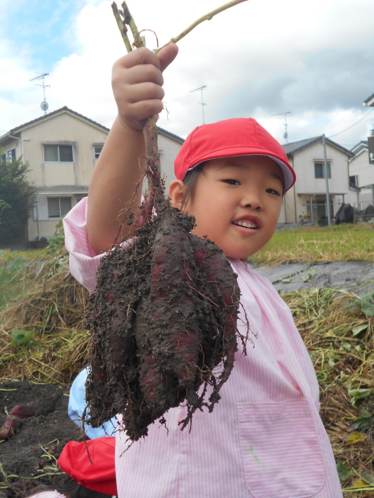 子どもたちは泥んこになりながらも掘り当てた大きなお芋に大喜び!